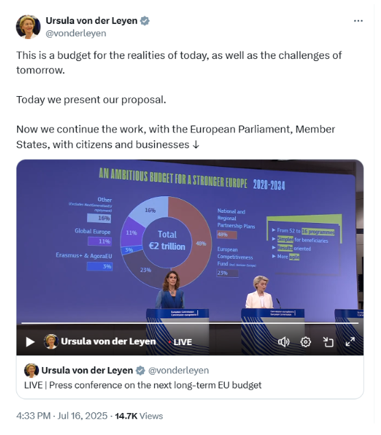 Σήμερα, το Σώμα των Επιτρόπων ενέκρινε την πρόταση της Επιτροπής για το επόμενο Πολυετές Δημοσιονομικό Πλαίσιο: τον προϋπολογισμό για την περίοδο 2028-2034. Πρόκειται για έναν προϋπολογισμό 2 τρισεκατομμυρίων για μια νέα εποχή. Ένας προϋπολογισμός που ανταποκρίνεται στις φιλοδοξίες της Ευρώπης. Αυτός αντιμετωπίζει τις προκλήσεις της Ευρώπης. Αυτός ενισχύει την ανεξαρτησία μας. Ένας προϋπολογισμός που είναι μεγαλύτερος, πιο έξυπνος και πιο σαφής. Αυτός είναι ένας προϋπολογισμός που προσφέρει αποτελέσματα για τους πολίτες μας, τις επιχειρήσεις μας, τους εταίρους μας και το μέλλον μας.