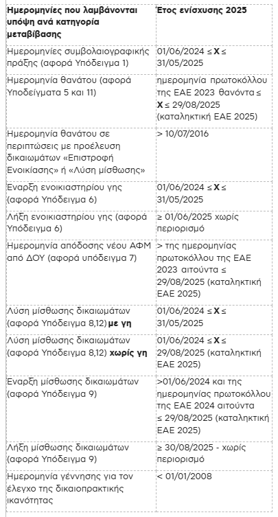 Παρακάτω παρατίθεται πίνακας με ημερομηνίες που είναι σε ισχύ για την μεταβίβαση δικαιωμάτων το έτος 2025 ανά υπόδειγμα μεταβίβασης.