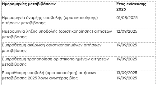 Καταληκτική ημερομηνία τροποποίησης ή και ακύρωσης εμπρόθεσμα οριστικοποιημένων αιτήσεων μεταβίβασης είναι η Παρασκευή 19/09/2025.