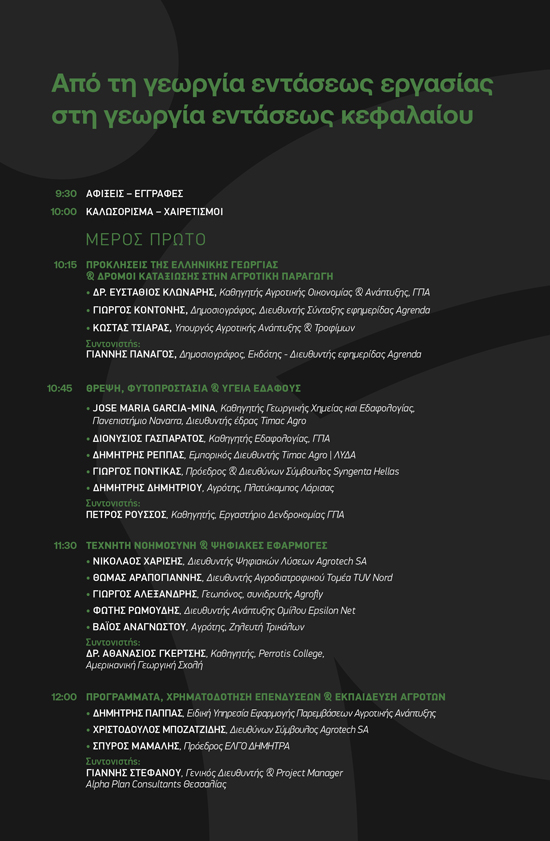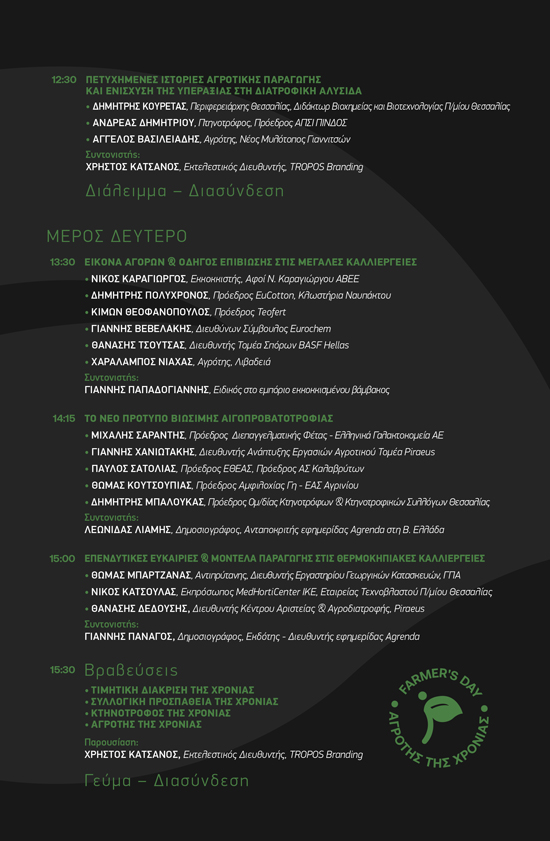 Το κλίμα δεν είναι και το καλύτερο για τον κόσμο της αγροτικής παραγωγής. Είναι πολλά τα «μαύρα σύννεφα» που σκεπάζουν την ελληνική γεωργία και κτηνοτροφία. Κρίθηκε ωστόσο από τη συντακτική ομάδα της Agrenda και την Οργανωτική Επιτροπή του Αγρότη της Χρονιάς, πως τώρα είναι η κατάλληλη ώρα να μιλήσουμε καθαρά. Να βάλουμε τα κρίσιμα ζητήματα στο τραπέζι και να αναζητήσουμε νέους δρόμους για ένα καλύτερο αύριο των αγροτών και την οργάνωση της αγροτικής παραγωγής στην Ελλάδα. Θα είμαστε λοιπόν όλοι εκεί, όχι για να κλάψουμε… πάνω από το χυμένο γάλα αλλά για να χαράξουμε νέα πορεία και να επιβάλλουμε, όλοι μαζί, τις λύσεις που έχει ανάγκη ο αγροτικός χώρος.